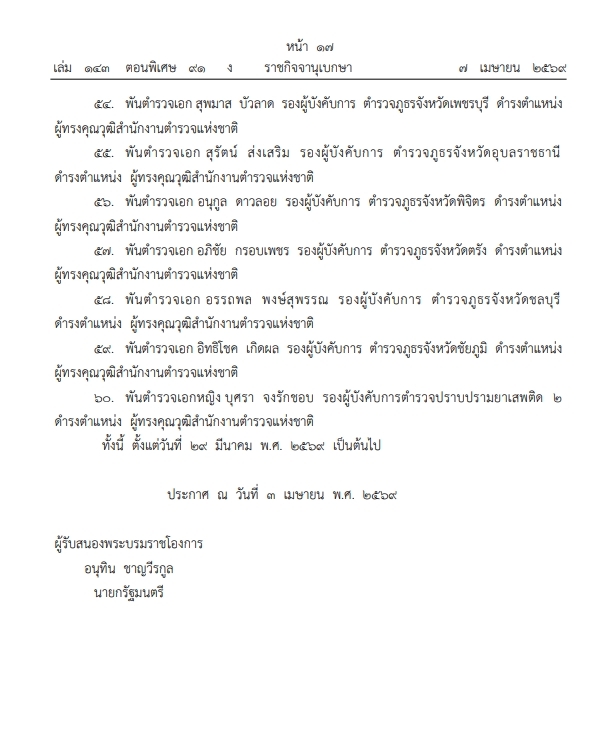 ราชกิจจานุเบกษา เผยแพร่ประกาศสํานักนายกรัฐมนตรี เรื่อง แต่งตั้งข้าราชการตํารวจ ให้ดํารงตําแหน่งต่างๆ จํานวน 60 นายวันนี้ (7 เม.ย.2569) เว็บไซต์ราชกิจจานุเบกษา ได้เผยแพร่ประกาศสํานักนายกรัฐมนตรี เรื่อง แต่งตั้งข้าราชการตํารวจ ความว่า