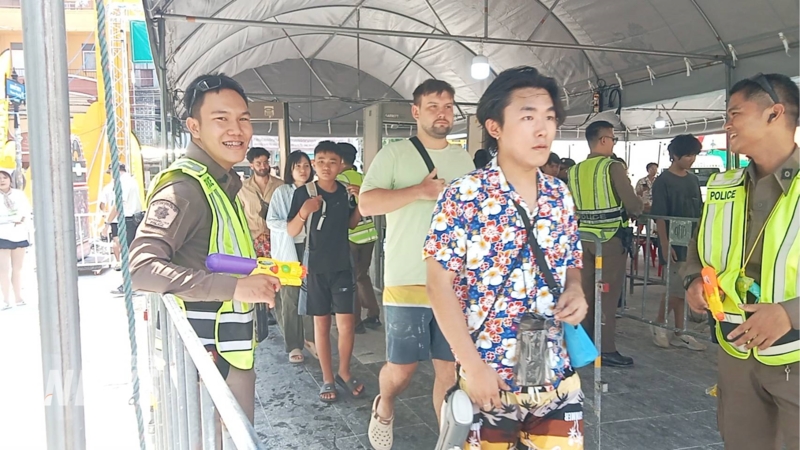 บรรยากาศการเล่นน้ำสงกรานต์ที่ถนนข้าวสาร เริ่มคึกคักตั้งแต่ช่วงเที่ยงที่ผ่านมา มีนักท่องเที่ยวทั้งชาวไทยและชาวต่างชาติ ทยอยเดินทางเข้ามาในพื้นที่อย่างต่อเนื่อง โดยทุกคนต้องผ่านจุดคัดกรอง บริเวณทางเข้า เพื่อตรวจค้นอาวุธและสิ่งผิดกฎหมาย ตามมาตรการรักษาความปลอดภัย