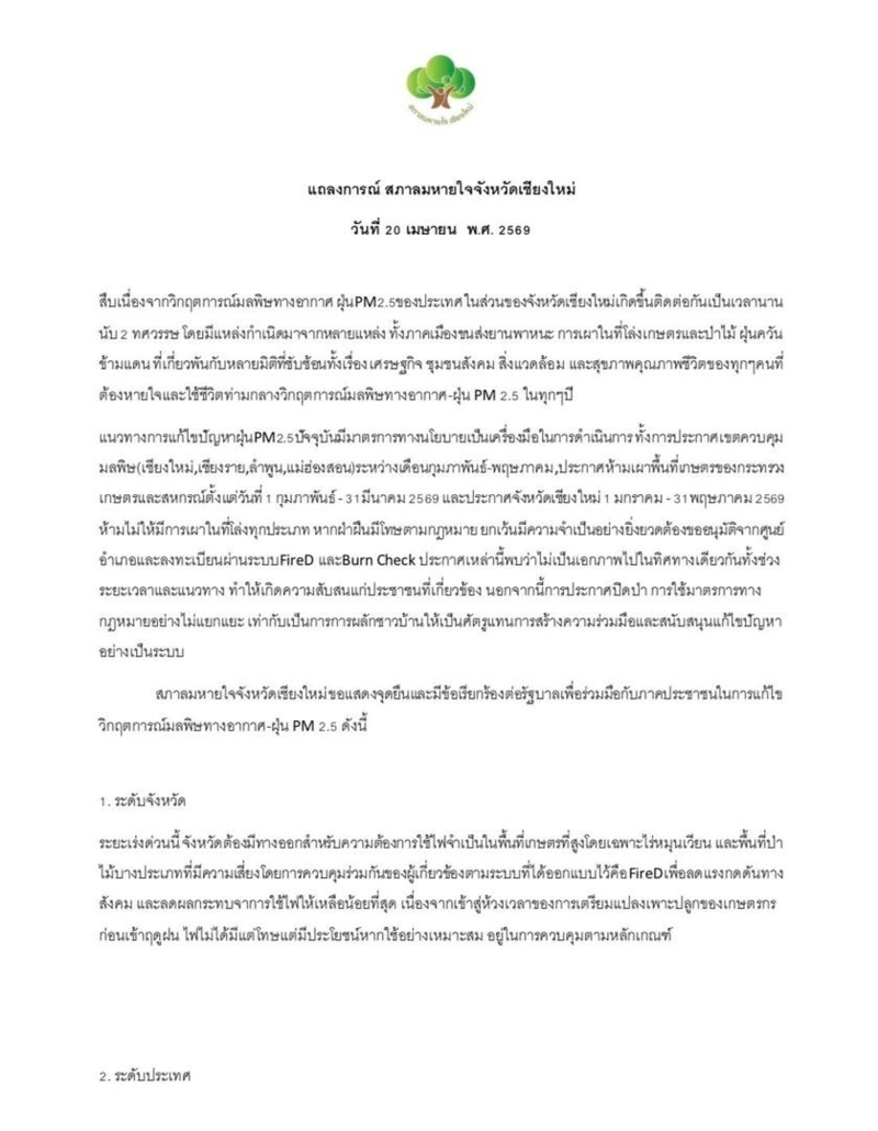 สภาลมหายใจเชียงใหม่ ออกแถลงการณ์ ชี้มาตรการแก้ฝุ่น PM2.5 ปัจจุบันขาดเอกภาพและผลักชาวบ้านเป็นศัตรู เรียกร้องรัฐบาลผลักร่าง พ.ร.บ.อากาศสะอาด ผ่านก่อน 13 พ.ค.69 เพื่อเปลี่ยนจากแก้ปัญหาปลายเหตุเป็นแก้ที่ต้นเหตุอย่างยั่งยืนวันนี้ (20 เม.ย.2569) สภาลมหายใจจังหวัดเชียงใหม่ พร้อมด้วยองค์กรภาคีเครือข่าย ร่วมกันออกแถลงการณ์แสดงจุดยืนต่อวิกฤตการณ์มลพิษทางอากาศและฝุ่น PM 2.5 ที่กัดกินสุขภาพและเศรษฐกิจของชาวเชียงใหม่และภาคเหนือ มานานกว่า 2 ทศวรรษ