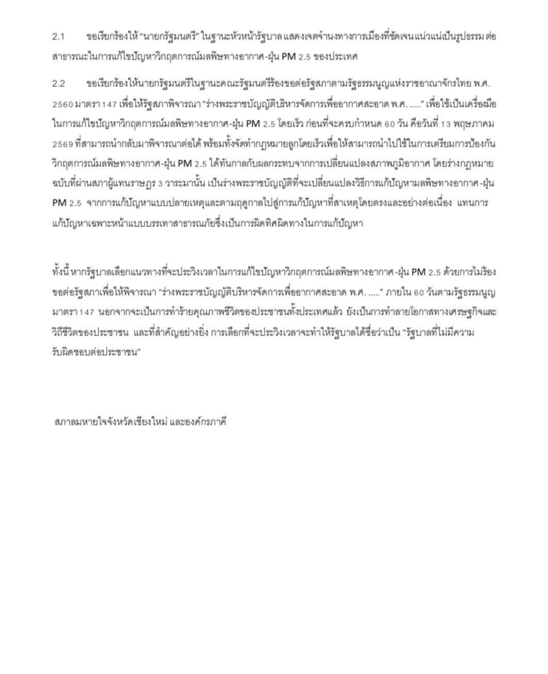 สำหรับข้อเรียกร้องระดับประเทศ ภาคีเครือข่ายได้ยื่นคำขาดถึงนายกรัฐมนตรีในฐานะหัวหน้ารัฐบาล ให้เร่งแสดงเจตจำนงทางการเมืองที่ชัดเจน โดยการร้องขอต่อรัฐสภาตามรัฐธรรมนูญมาตรา 147 เพื่อนำ "ร่างพระราชบัญญัติบริหารจัดการเพื่ออากาศสะอาด พ.ศ. ...." ที่ผ่านความเห็นชอบมาแล้ว 3 วาระ กลับมาพิจารณาต่อโดยเร็วที่สุด ซึ่งมีกำหนดเส้นตาย 60 วันที่จะสิ้นสุดลงในวันที่ 13 พ.ค.2569 เพื่อให้กฎหมายดังกล่าวเป็นเครื่องมือหลักในการเปลี่ยนวิธีทำงานจากการแก้ปัญหาตามฤดูกาล ไปสู่การจัดการเชิงโครงสร้างที่ครอบคลุมไปถึงกฎหมายลูกเพื่อรับมือกับการเปลี่ยนแปลงสภาพภูมิอากาศได้ทันท่วงที